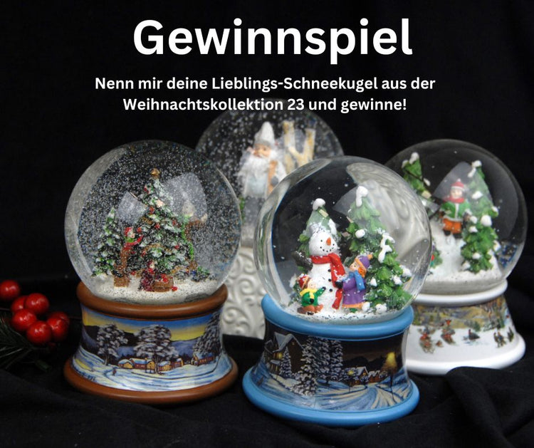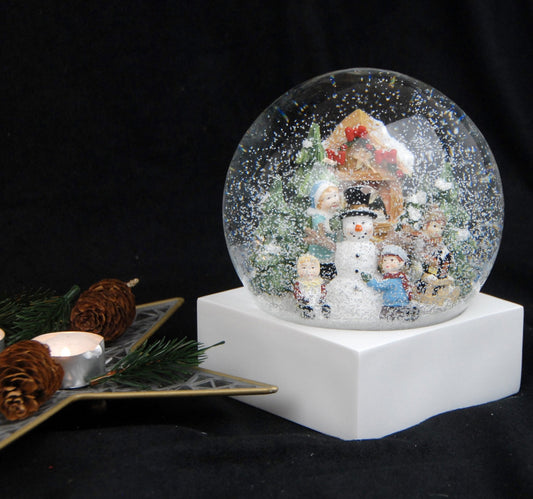 Schneekugel Kinder bauen Schneemann auf Sockel nostalgische Schneelandschaft mit Spieluhr 10 cm Durchmesser
