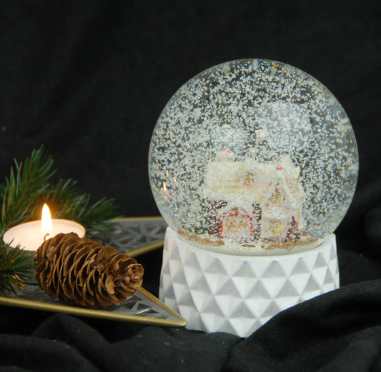 Edle Schneekugel Zuckerbäckerhaus auf weißem Ornamentsockel 100 mm Durchmesser mit Spieluhr