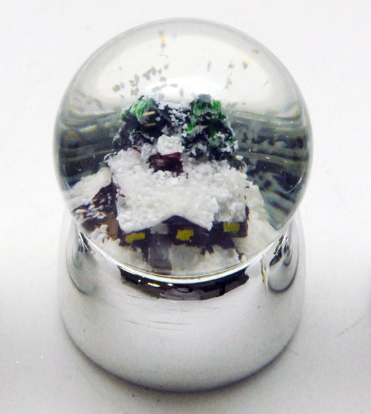 Süße Mini-Schneekugeln Winterhütte auf Silber-Sockel gerade glänzend
