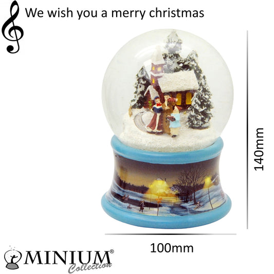 Schneekugel Weihnachtsspaziergang auf Sockel Winterlandschaft Eisläufer blau mit Spieluhr 10 cm Durchmesser