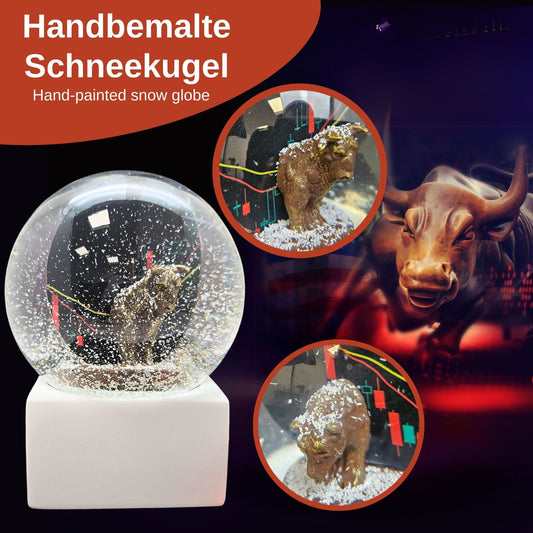 Moderne Designer Schneekugel Börse Bulle & Bär auf Sockel weiß eck 100 mm Durchmesser