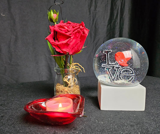 Moderne Designer Schneekugel LOVE auf Sockel weiß eck 100 mm Durchmesser