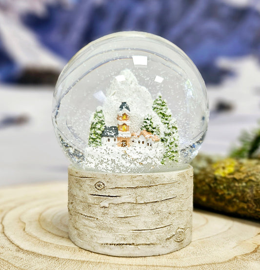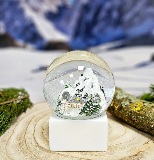 Schneekugel Bergdorf auf Holzsockel "Country-Line" 10 cm Durchmesser