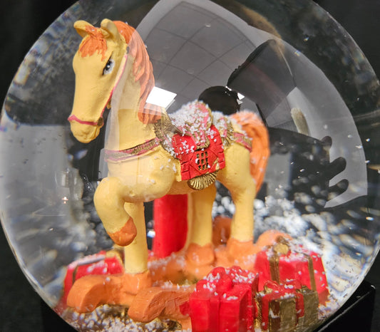 Schneekugel Schaukelpferd mit Geschenken rot eck "PURE-Line" 10 cm Durchmesser