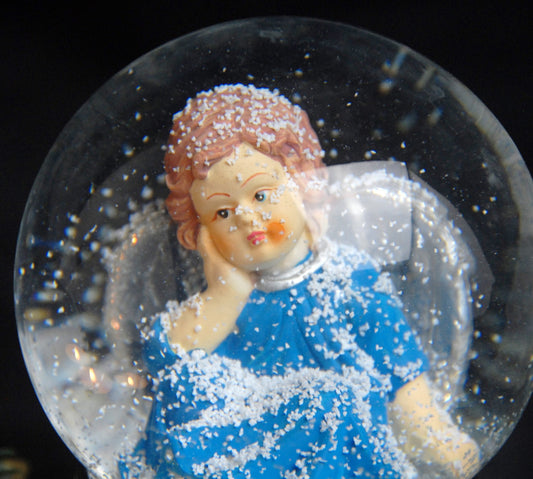 Schneekugel Engel blau auf Sockel Silber mit Sternen mit Spieluhr 10 cm Durchmesser