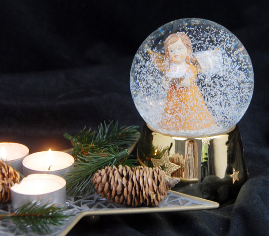 Schneekugel Engel orange Schale auf Sockel gold mit Sternen mit Spieluhr 10 cm Durchmesser