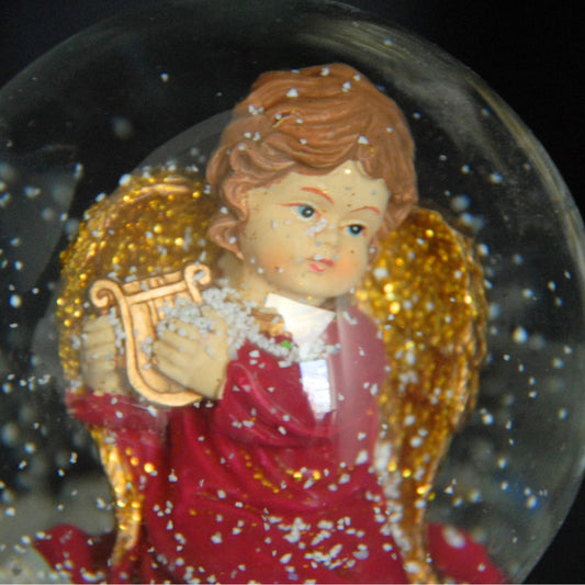 Schneekugel Engel rot mit Harfe gold auf Sockel weiß mit Sternen gold rot mit Spieluhr 10 cm Durchmesser