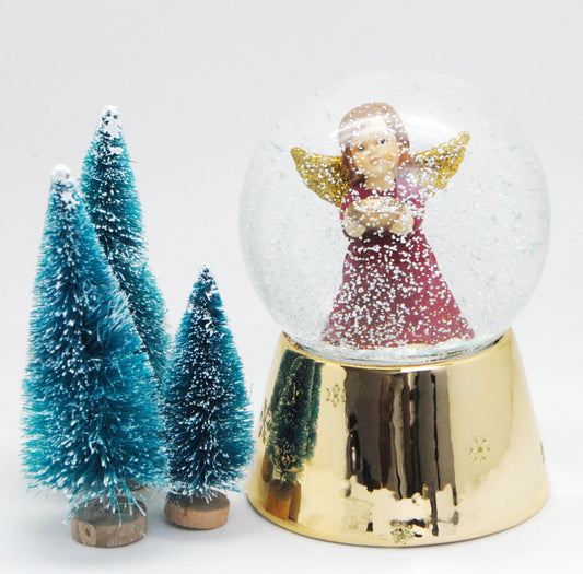 Schneekugel Engel rot mit Schale gold auf Sockel gold mit Sternen mit Spieluhr 10 cm Durchmesser