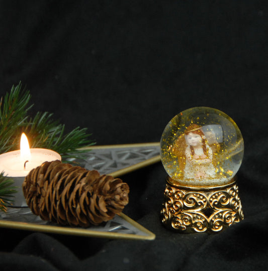 Mini-Schneekugel Engel mit Haarkranz auf verziertem Sockel gold 45mm Durchmesser