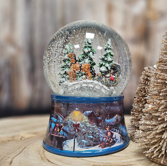 Nostalgische Schneekugel Kutsche über Brücke auf Sockel Eisläufer 100 mm Durchmesser mit Spieluhr