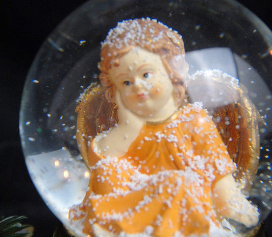 Schneekugel Engel orange sitzt auf Sockel gold mit Sternen mit Spieluhr 10 cm Durchmesser