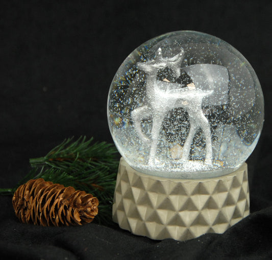 Nostalgische Schneekugel Reh weiß auf Silber Sockel mit Schneeflocken 100 mm Durchmesser mit Spieluhr