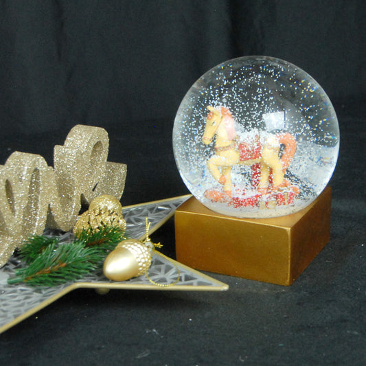 Designer Schneekugel Schaukelpferd mit Geschenken rot gold Sockel gold eck PURE-Line 12 cm Durchmesser