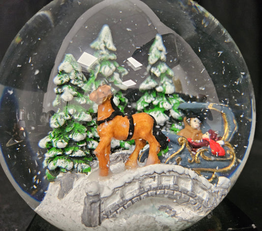 Nostalgische Schneekugel Kutsche über Brücke auf Zinn-Sockel 100 mm Durchmesser mit Spieluhr