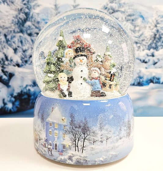 Nostalgie-Schneekugel mit Kindern und Schneemann mit Spieluhr - 100mm Durchmesser
