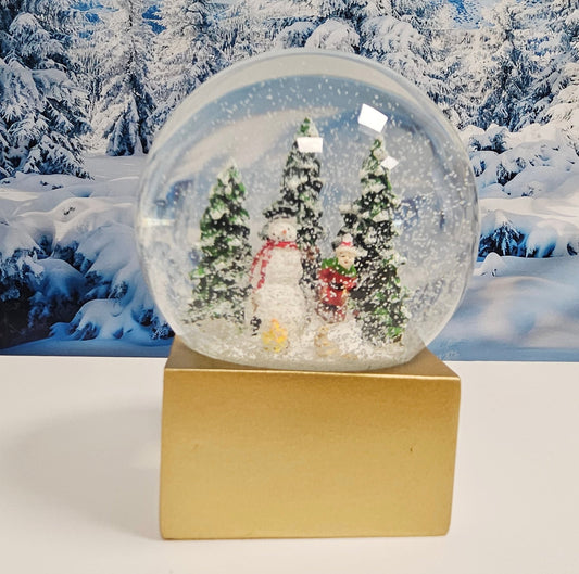 Schneekugel Schneemann steht vor Lagerfeuer auf Sockel golden eckig "PURE-Line" 10 cm Durchmesser
