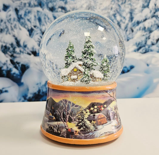 Nostalgische Schneekugel Verschneite Winterhütte auf Winterlandschaft Ocker 100 mm Durchmesser mit Spieluhr