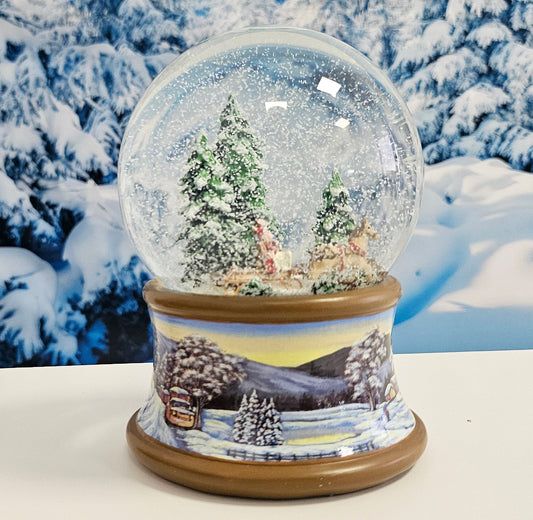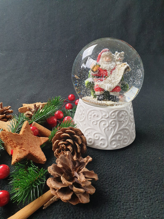 Edle Schneekugel auf weißem Porzellansockel Santa 100 mm mit Spieluhr