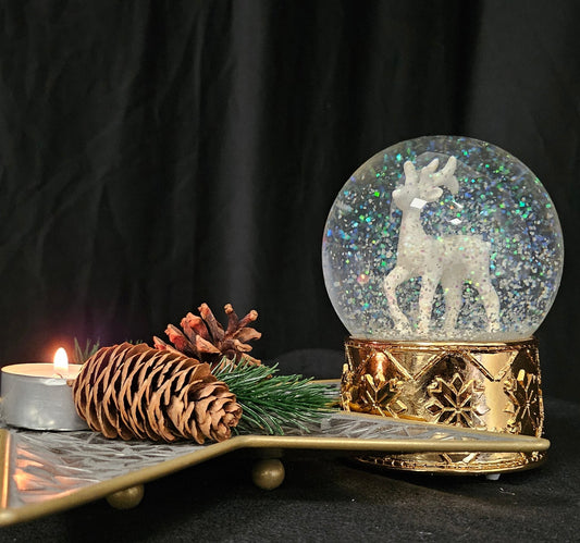 Schneekugel Reh weiß mit kupfergold-Sockel Schneeflocke mit Spieluhr