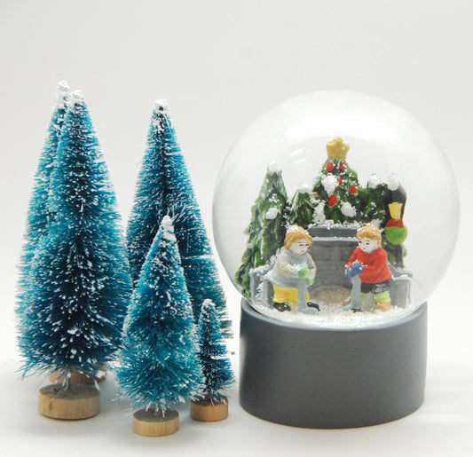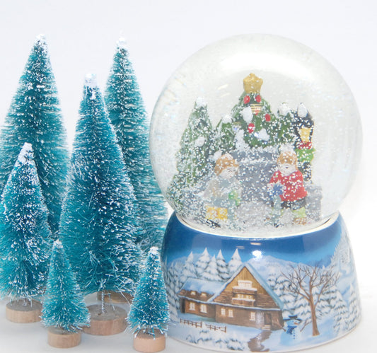 Schneekugel Weihnachtsbaum schmücken auf Sockel Winterlandschaft Eisläufer blau mit Spieluhr 10 cm Durchmesser