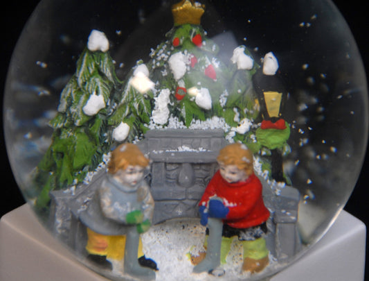Schneekugel Tannenbaum schmücken auf silber Sockel mit Sternen mit Spieluhr 10 cm Durchmesser