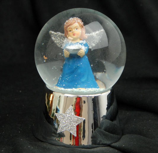 Schneekugel Engel blau mit Schale auf Sockel Silber mit Sternen mit Spieluhr 10 cm Durchmesser