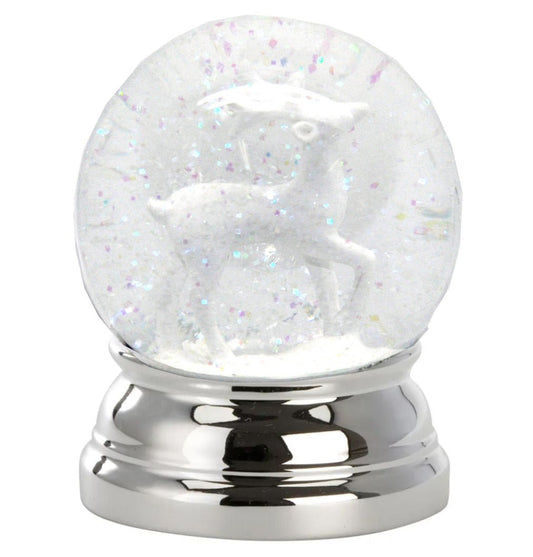 Schneekugel Reh / Hirsch weiß auf Sockel silber rund geschwungen 10 cm Durchmesser