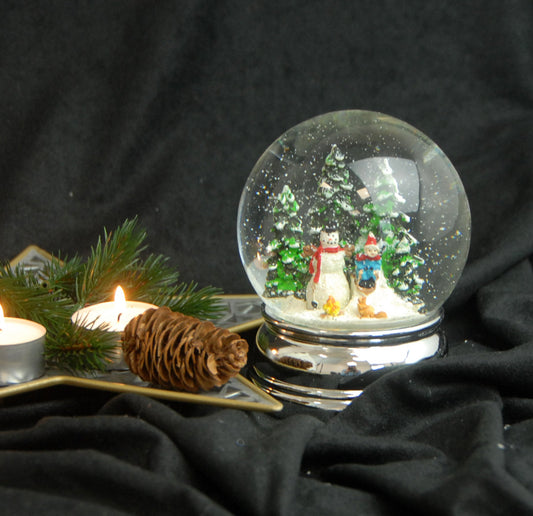 Schneekugel Schneemann mit Kind auf Schlitten auf Sockel silber rund geschwungen 10 cm Durchmesser