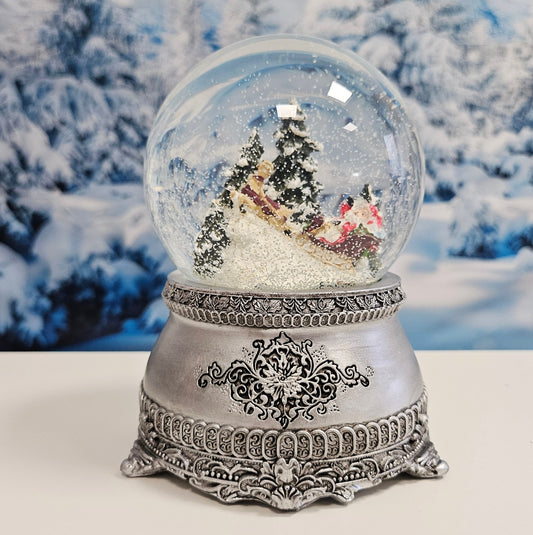 Nostalgische Schneekugel Santa im Schlitten auf Zinnsockel 100 mm Durchmesser mit Spieluhr
