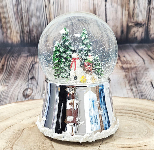 Nostalgische Schneekugel Schneemann steht auf Silber Sockel mit Schneeflocken 100 mm Durchmesser mit Spieluhr