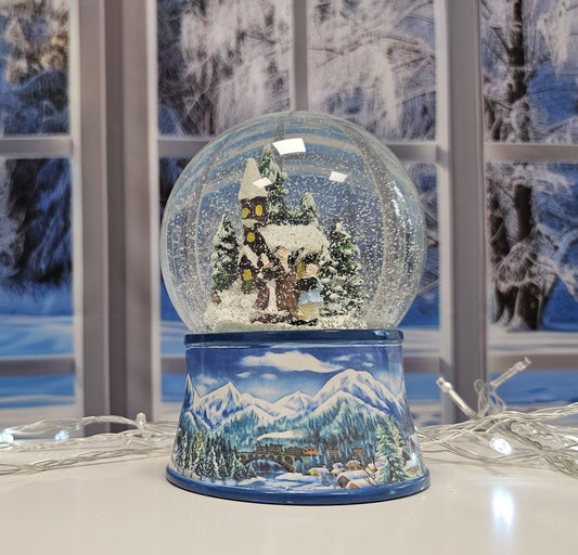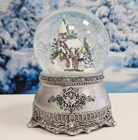 Nostalgische Schneekugel Weihnachtsspaziergang auf Zinnsockel 100 mm Durchmesser mit Spieluhr