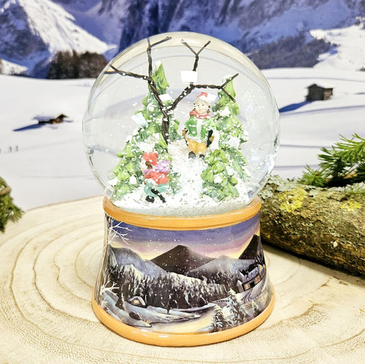 Nostalgische Schneekugel Skifahrer auf Sockel Winterlandschaft ocker 100 mm Durchmesser mit Spieluhr