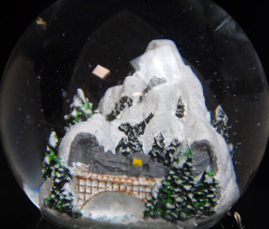 Nostalgische Schneekugel Berg mit Brücke Winterlandschaft blauer Rand 100 mm Durchmesser mit Spieluhr