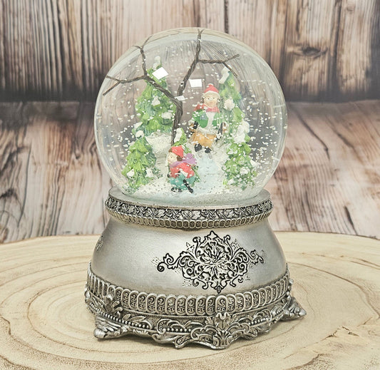 Nostalgische Schneekugel Familie Winterspaziergang auf Sockel Eisläufer 100 mm Durchmesser mit Spieluhr