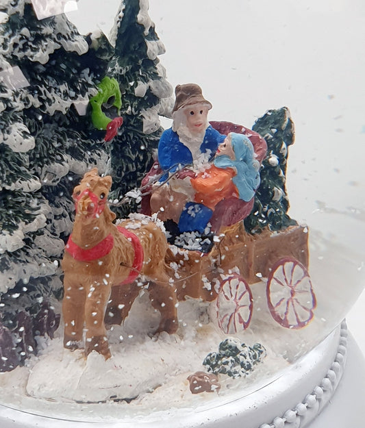 Schneekugel Kutschfahrt auf Sockel weiß nostalgisch 100 mm Durchmesser mit Spieluhr