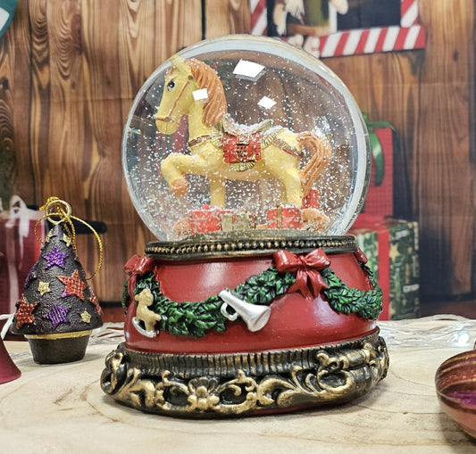 Schöne Schneekugel Schaukelpferd mit Geschenken auf Sockel Weihnachtsdekor rot mm Durchmesser mit Spieluhr