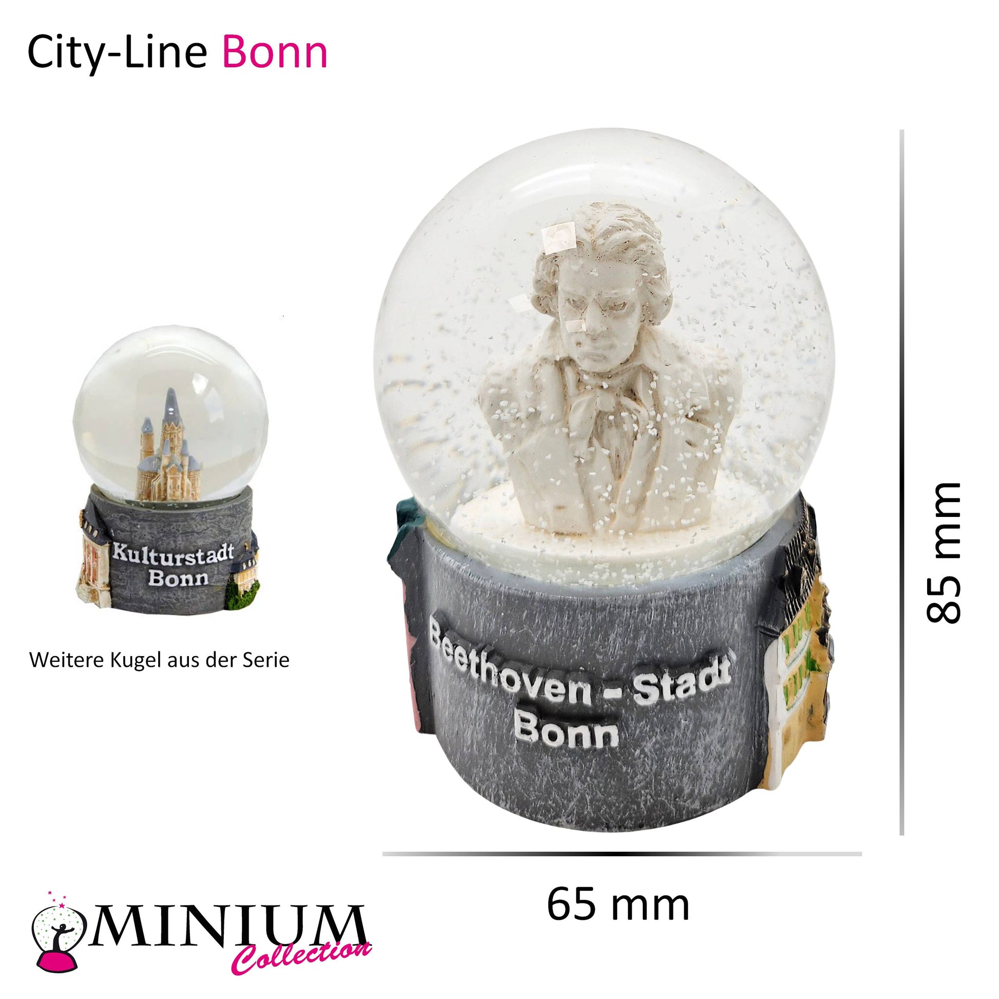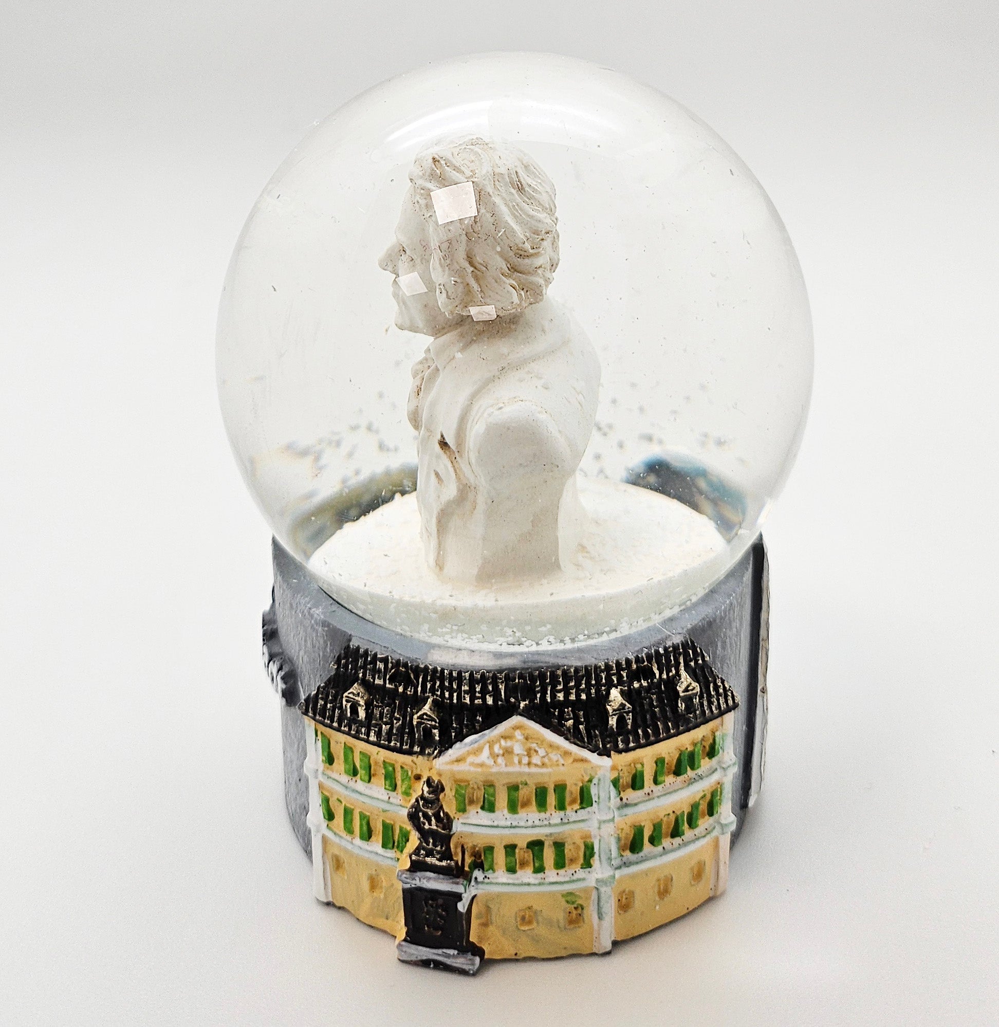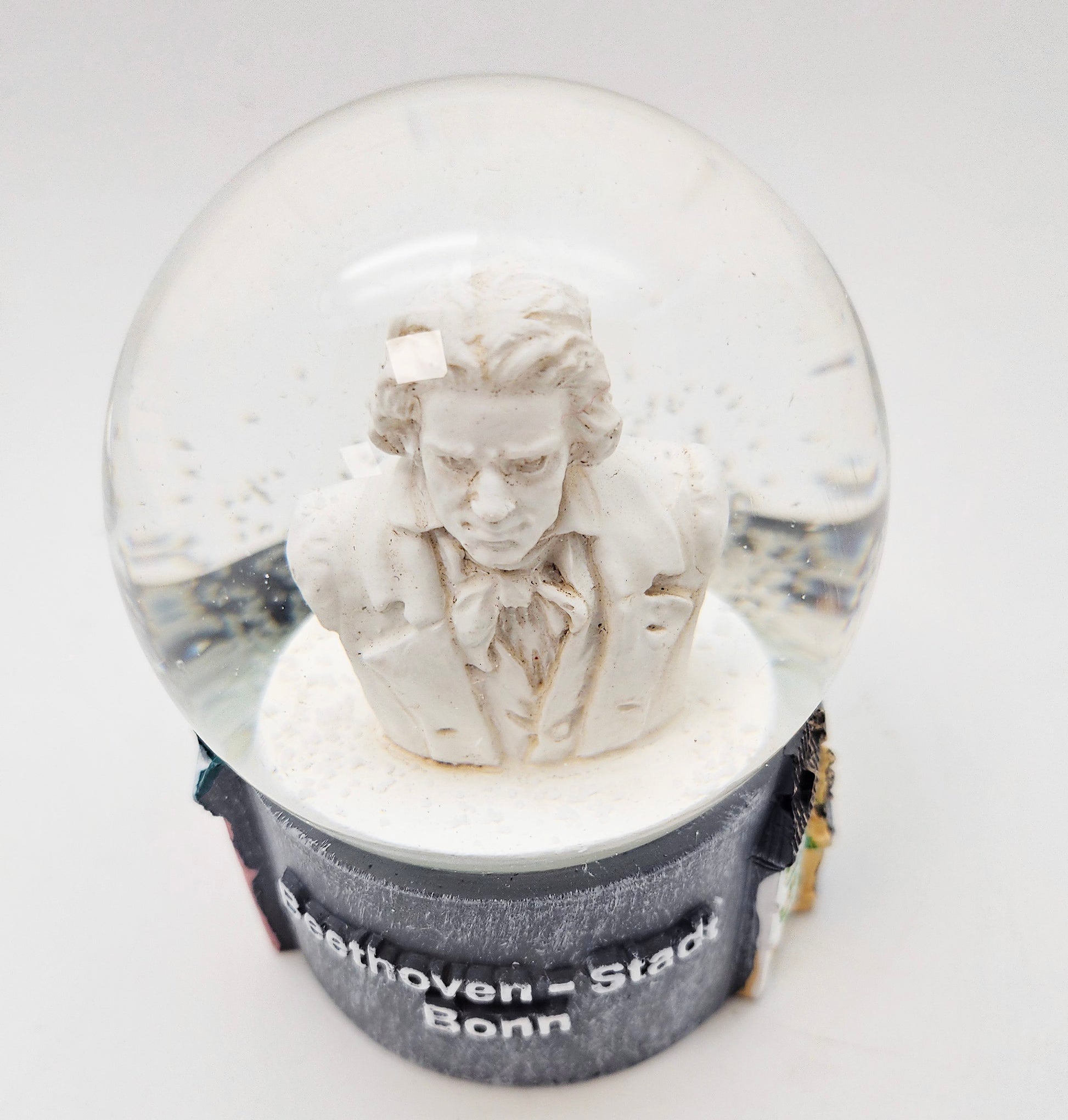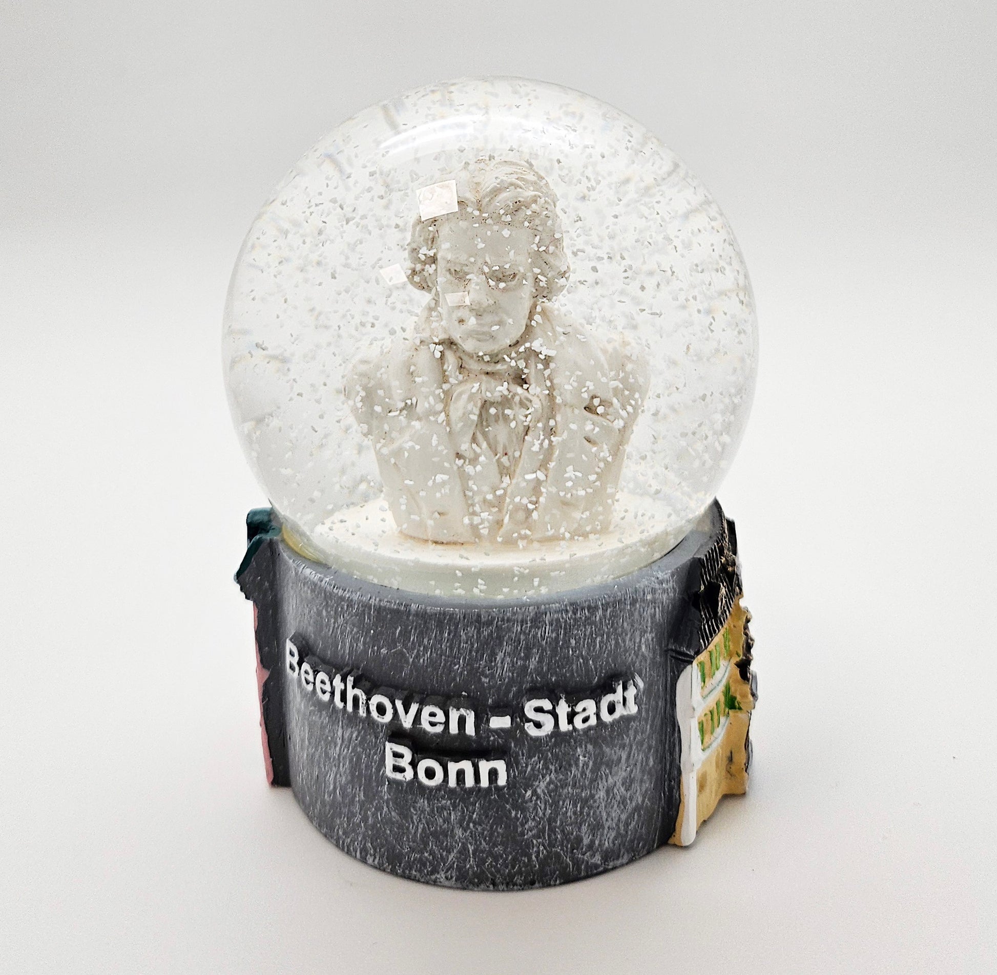 Eine Souvenir Schneekugelder Marke MINIUM-Collection. Im Zentrum der Schneekugel steht eine Büste von Ludwig van Beethoven. Auf dem Sockel sind das Geburtshaus in Bonn, ein Notenblatt sowie die erste Beethovenhalle mit Denkmal liebevoll in Szene gesetzt.