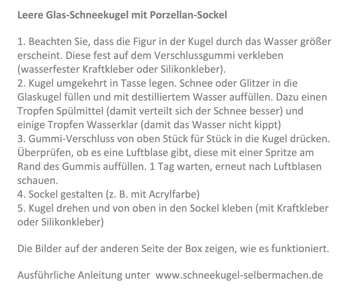 Bastelset Glas-Schneekugel: Eine Glas-Schneekugel mit Porzellansockel zum Selberbasteln, in die man auch noch eine Spieluhr einbauen kann. Die Spieluhr wird nicht mitgeliefert, kann aber dazu bestellt werden.Das Set besteht aus dem Glas, dem passenden Gummi-Verschluss und dem Porzellan-Sockel sowie einer Plastikplatte, mit der der Sockel unten verschlossen wird (mit Kleber). Auf diese Platte können Sie bei Bedarf eine Spieluhr aufschrauben oder eine bereits vorkonfigurierte Spieluhr (40014 oder 40017) einsetzen. Wenn Sie eine Schneekugel ohne Spieluhr möchten, dann kleben Sie die Platte einfach so ein.
