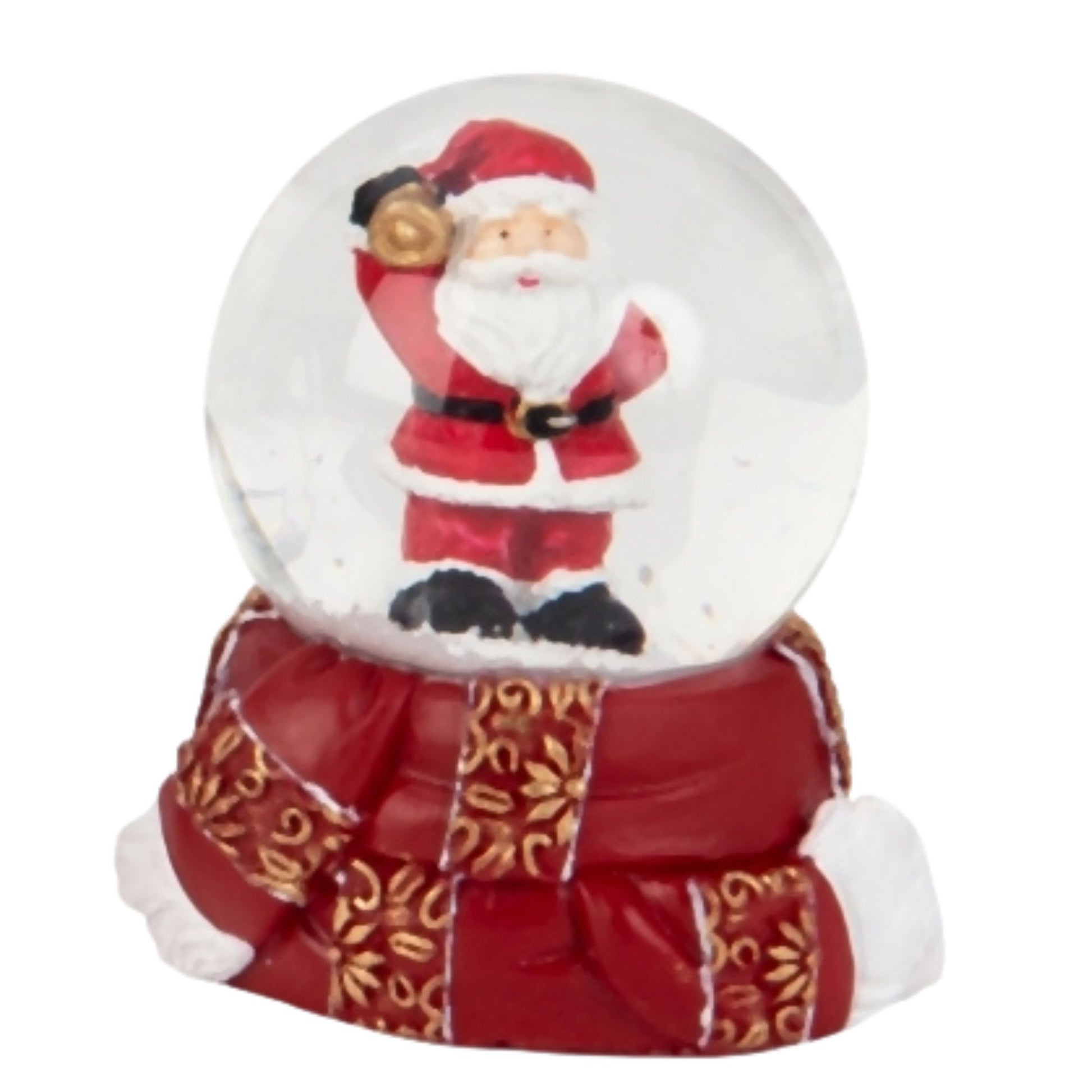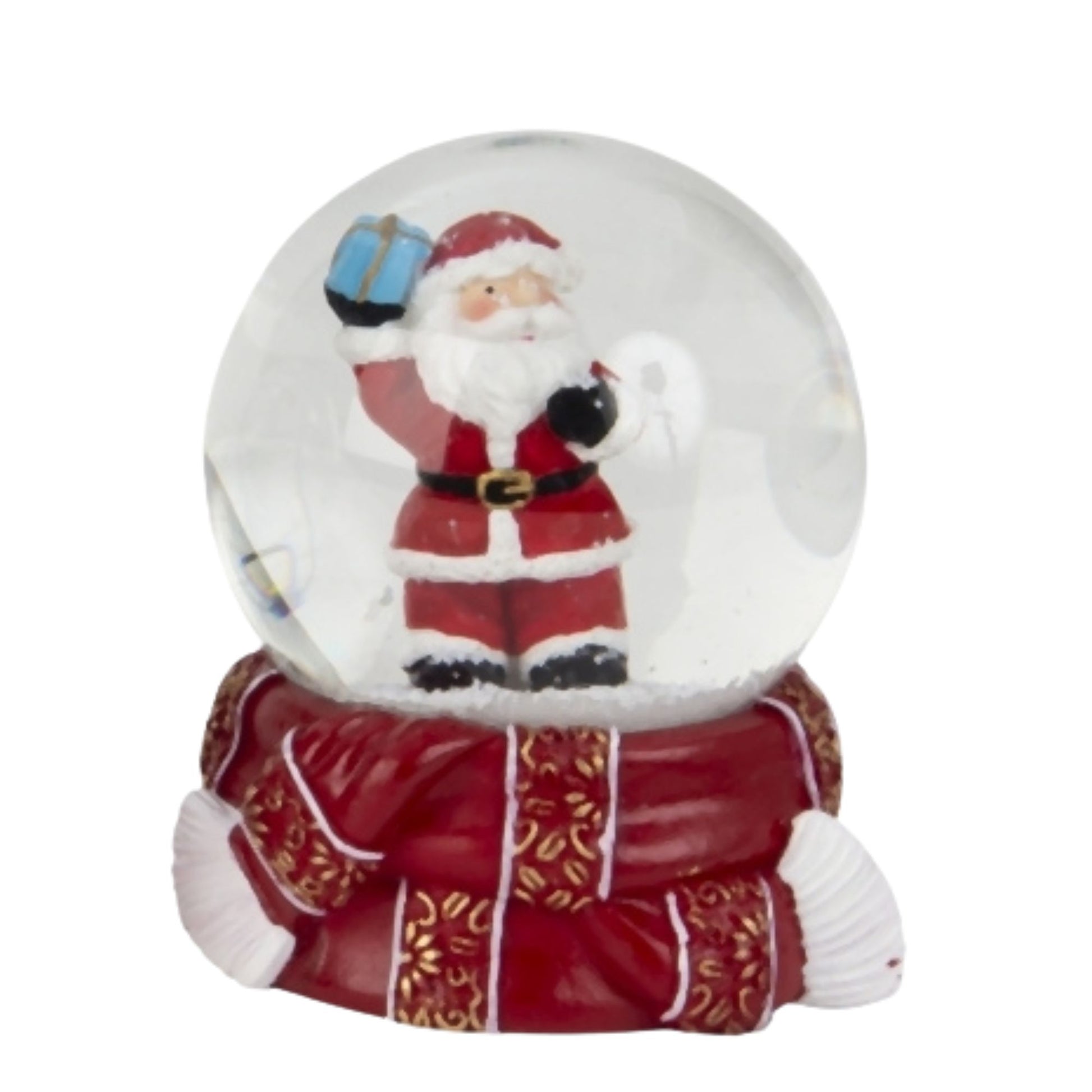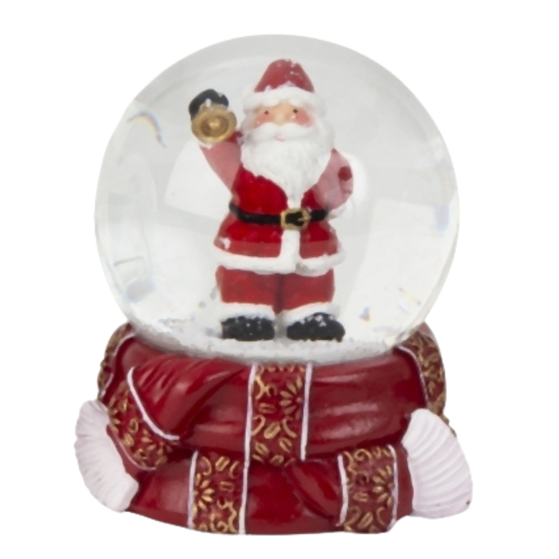 - Schneekugel mit Spieluhr, Schneekugel mit Weihnachtsmann neben goldenem Christbaum.