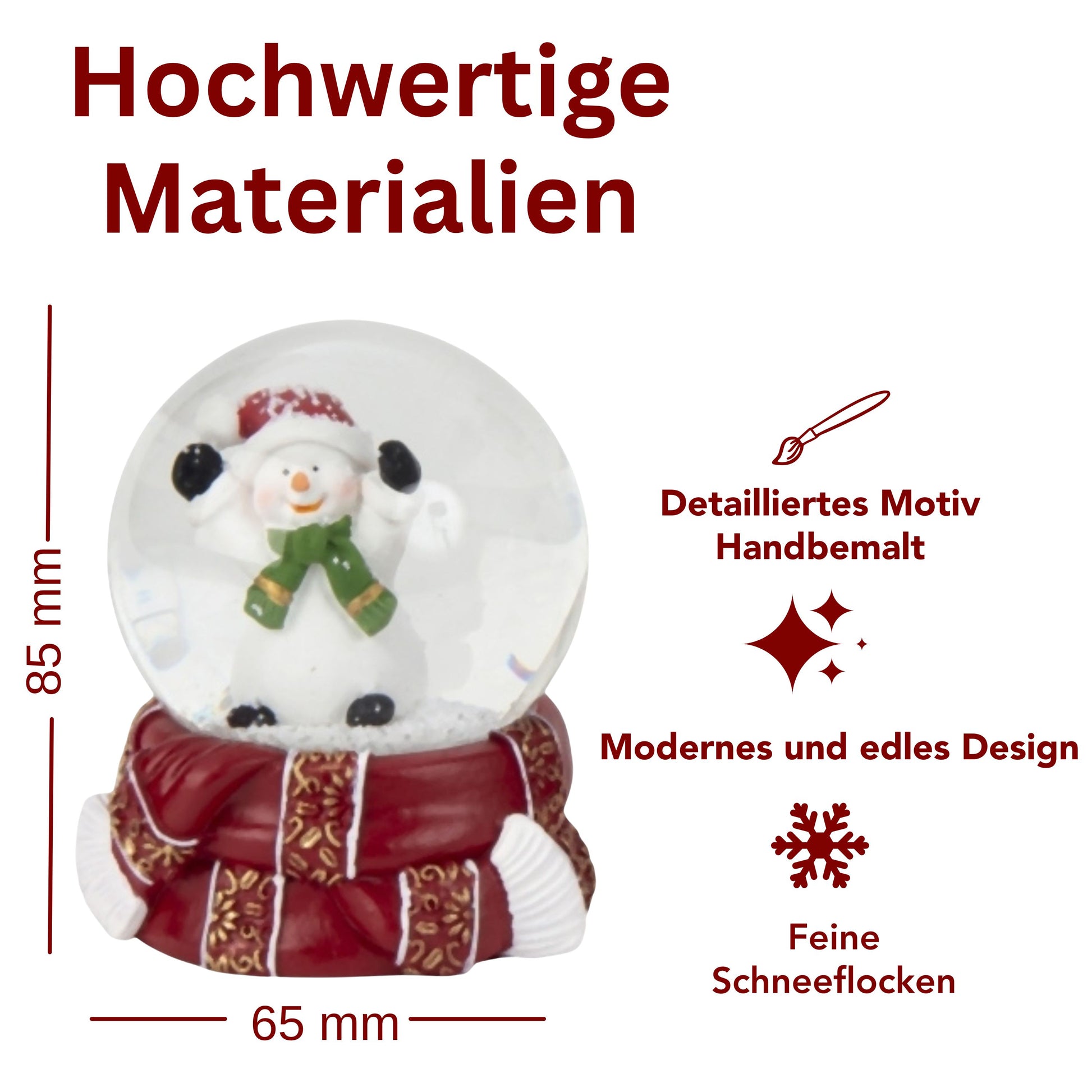 4 Schneekugel Winter/Weihnachten mit Schneemann und Weihnachtsmann auf einem Sockel in rot/gold in Form eines Winterschals