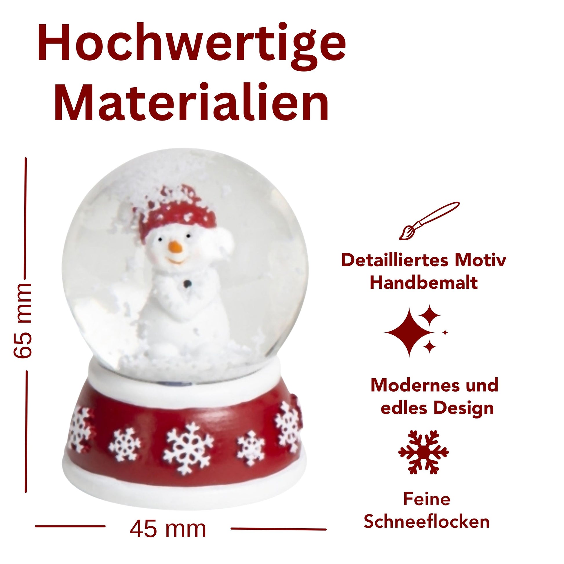 4 Schneekugel Winter/Weihnachten mit Schneemann auf einem Sockel in rot mit weißen Schneekristallen