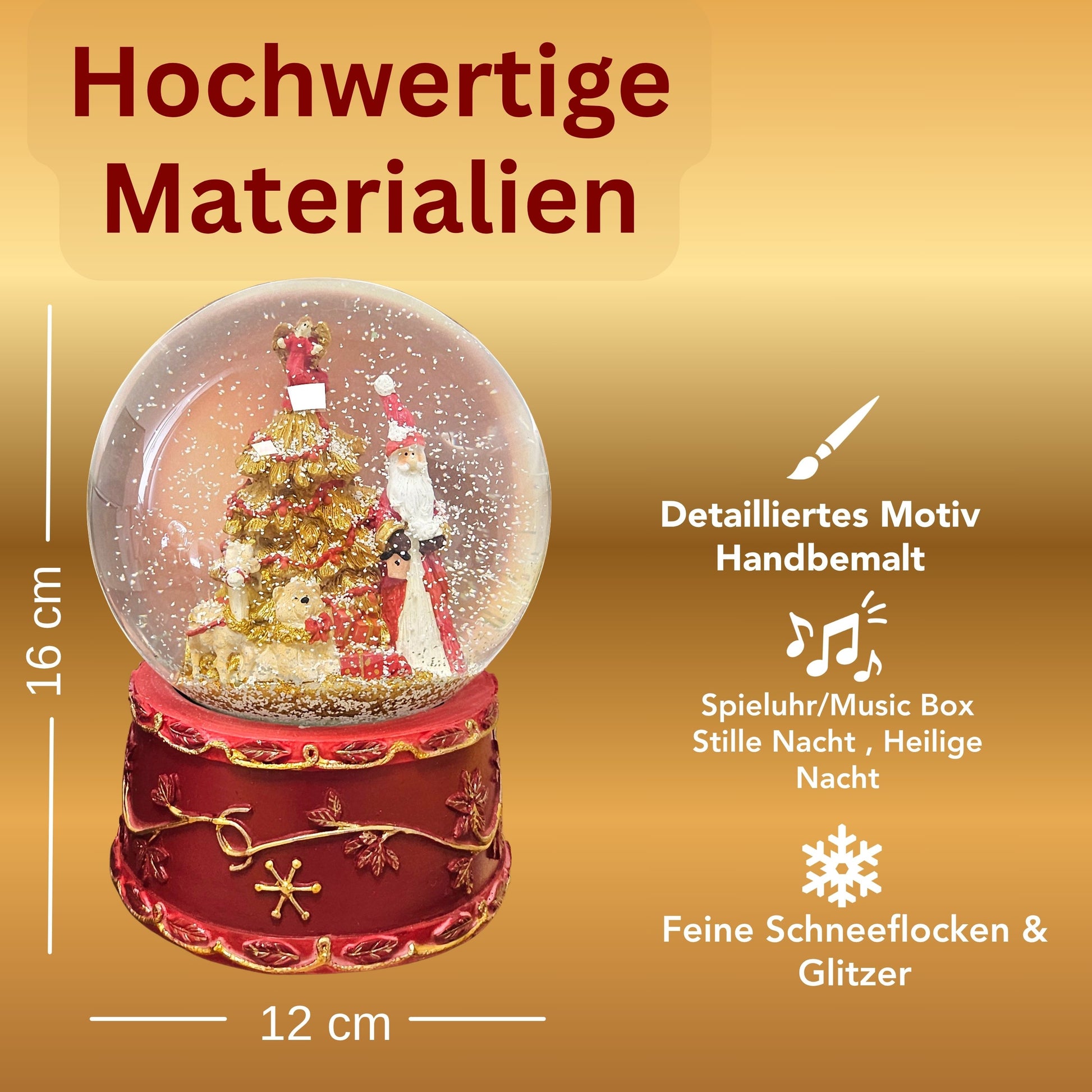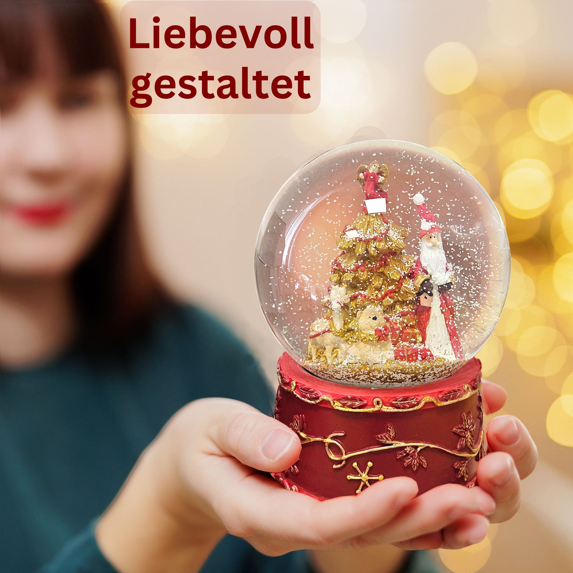 - Schneekugel mit Spieluhr, Schneekugel mit Weihnachtsmann neben goldenem Christbaum.