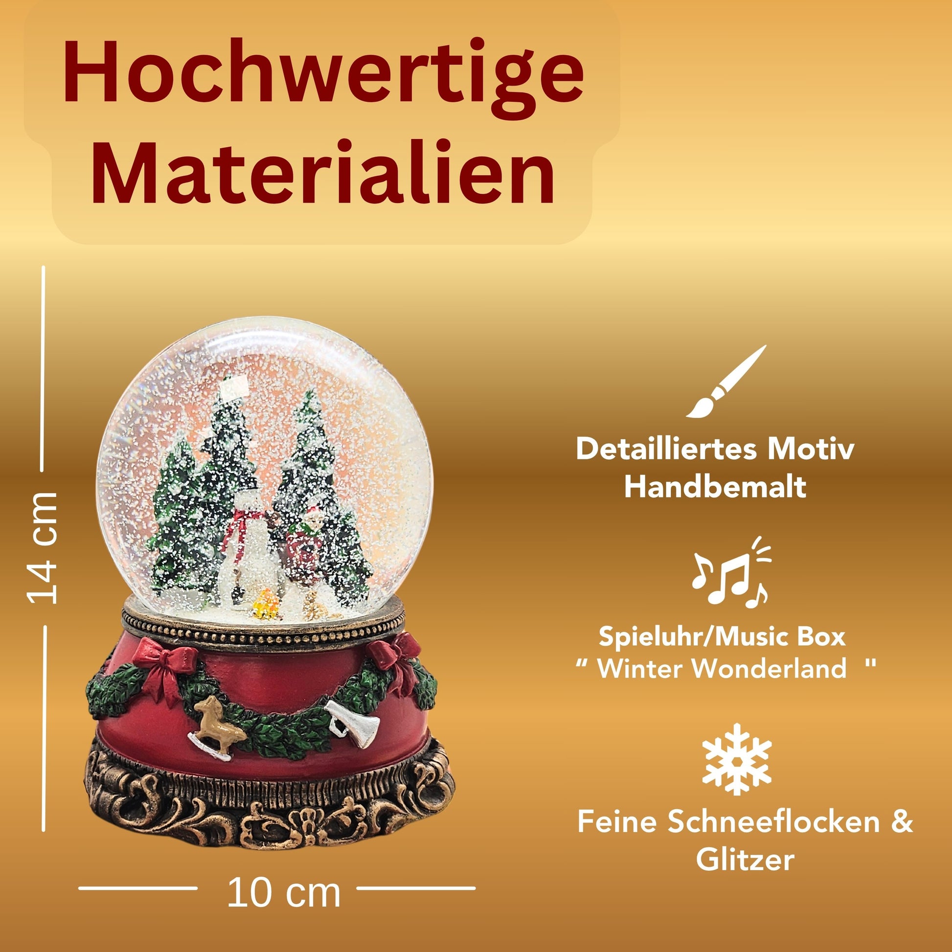 - Schneekugel mit Sockel Weihnachten-Dekor in rot, Schneekugel mit Schneemann neben Kind auf Schlitten, mit Spieluhr Winter Wonderland