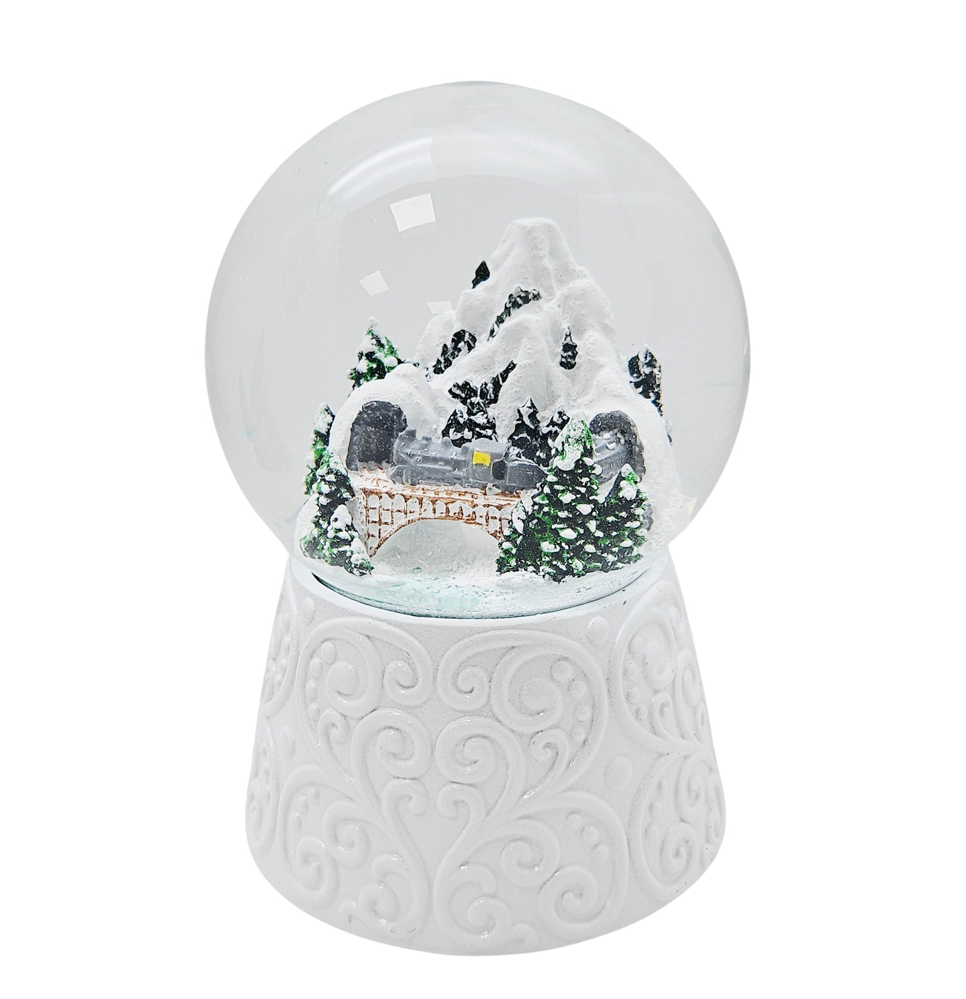 Nostalgische Schneekugel Berglandschaft mit Brücke auf Sockel weiß Ornamente 100 mm Durchmesser mit Spieluhr