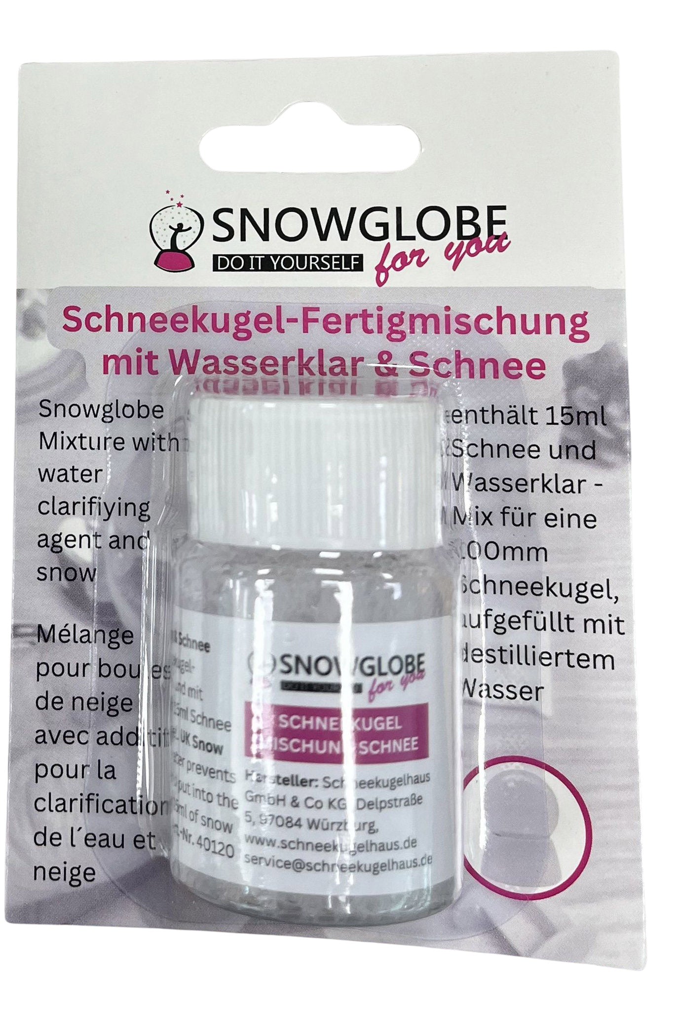 Jetzt gibt es eine Schneekugel-Fertigmischung für das Gestalten einer eigenen Schneekugel. Die Mischung enthält 15ml Flüssigkeit. Darin enthalten ist der feine Schnee und Wasserklar-Mix (Konservierungsmittel) für eine 100mm Schneekugel. Diese Mischung wurde aufgefüllt mit destilliertem Wasser.