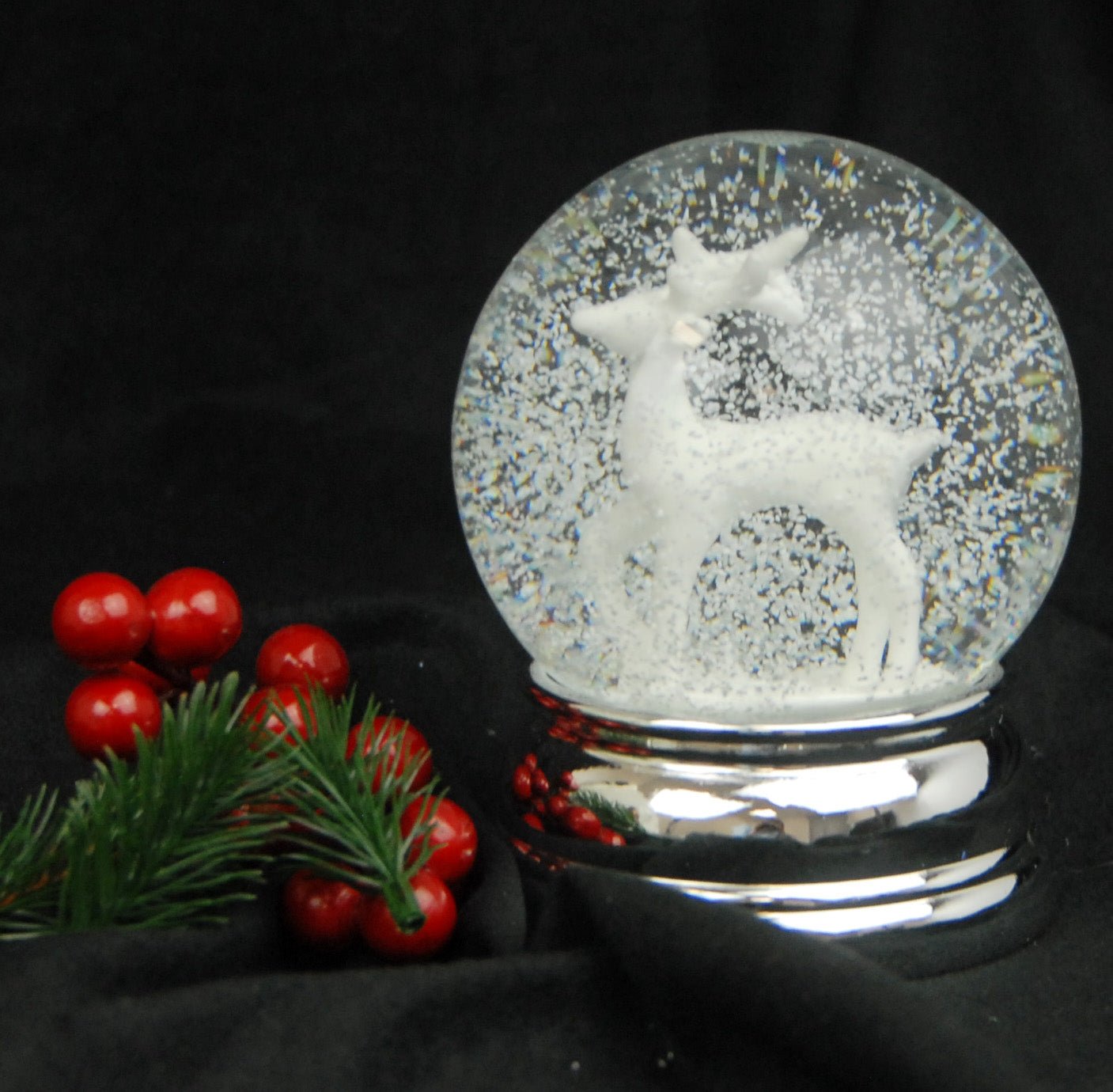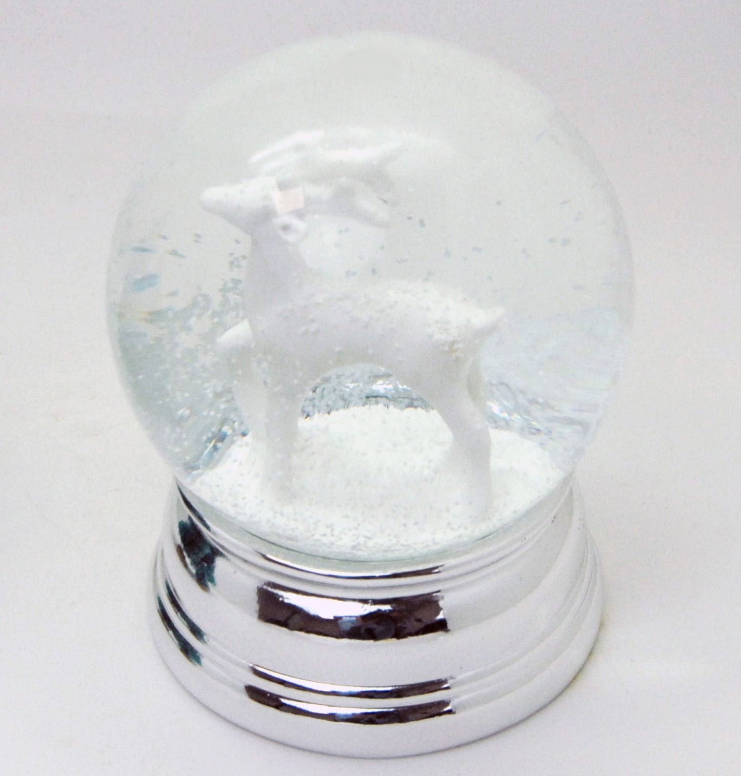 Schneekugel Reh / Hirsch weiß auf Sockel silber rund geschwungen 10 cm Durchmesser