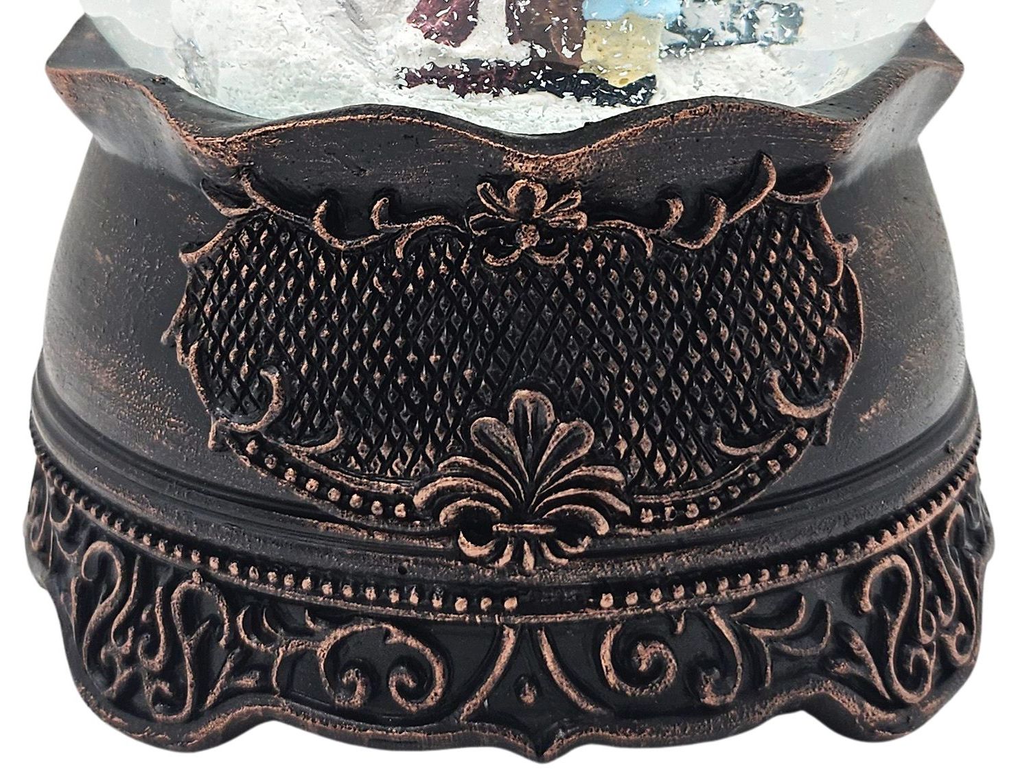 Der passende Sockel für eine -Schneekugel im Durchmesser 100mm. Der Sockel ist aufwendig mit einem nostalgischen Ornamentmuster in antik Kupfer gestaltet. In diesen Sockel können Sie unten eine Spieluhr auf Platte einbauen. Der Sockel hat unten ein Loch.
